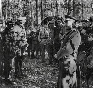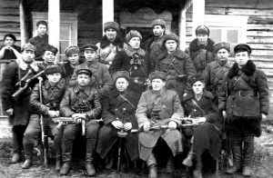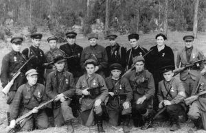 Секретарь Пинского подпольного ОК КП(б)Б Клещев А.Е. (сидит в центре) и командир соединения Корж В.3. среди командного состава бригад и отрядов