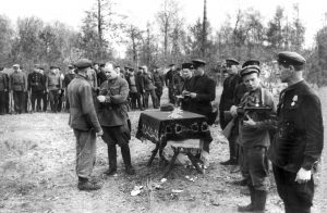 Командир соединения Корж В.3. вручает награды партизанам, 1943г.
