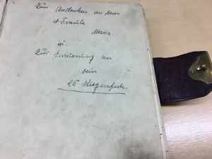 В числе партизанских трофеев оказалась и добротная книжка для деловых  записей в кожаном переплете, с застежкой, снабженной небольшим замочком, в которой Василий Захарович вел потом, начиная с июля 1941-го и по ноябрь 1942 года свои дневниковые записи. На внутренней стороне обложки некая немецкая фройляйн написала краткое посвящение своему парню, благословляя на фиксацию интересных впечатлений о «делах» его на Восточном фронте.