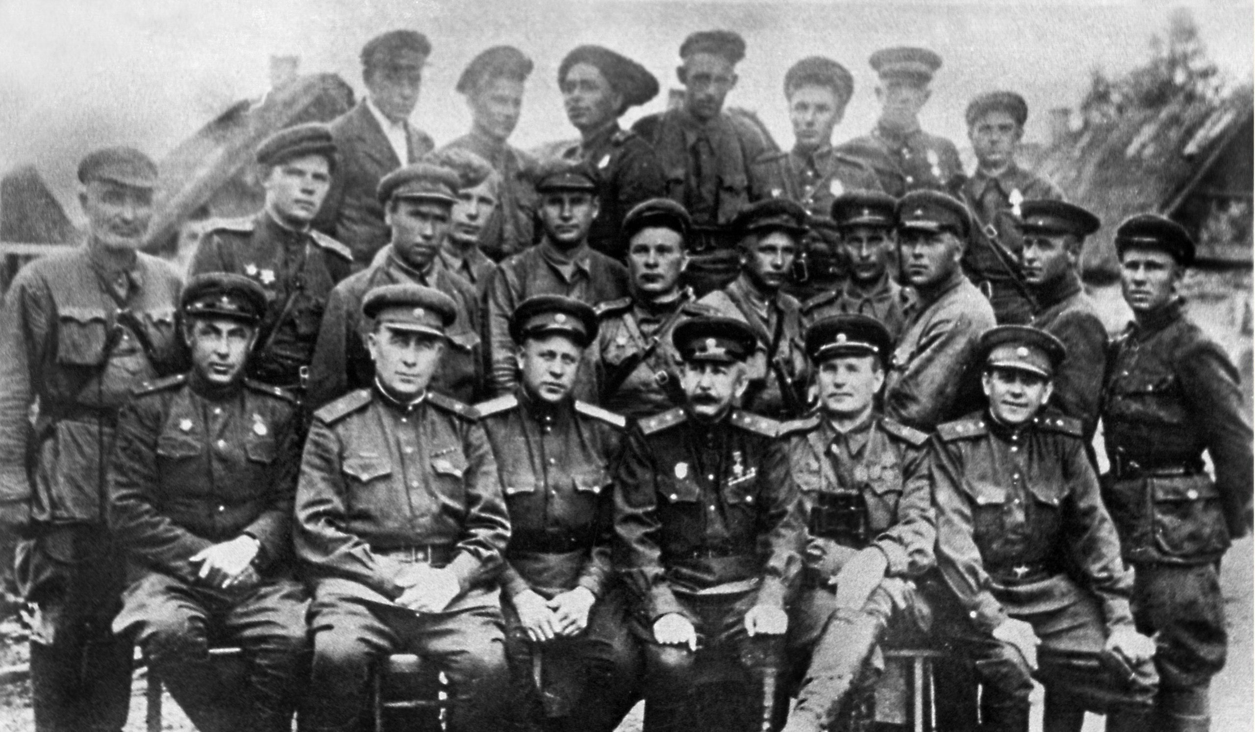 Командующий 61-й армией генерал-лейтенант Белов П.А. (сидит третий справа) с командованием Пинского партизанского соединения