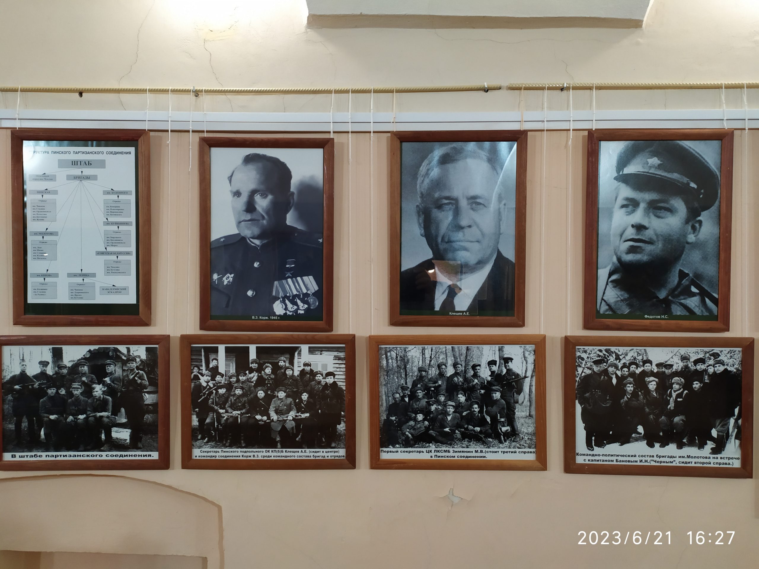 На каждой из них – мраморная плита с именами командиров партизанских отрядов и соединений, действовавших на территории Пинского Полесья. Мемориальная плита, расположенная в центре композиции, посвящена прославленному партизанскому командиру Герою Советского Союза Василию Захаровичу Коржу.